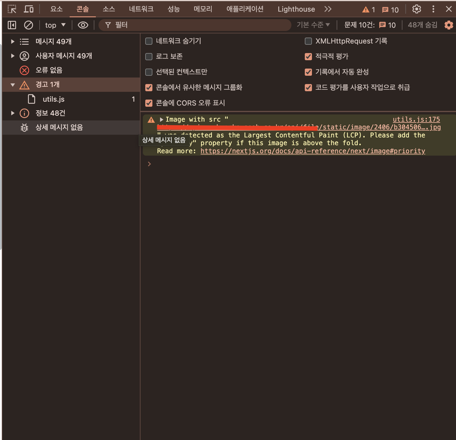 이 메시지는 Next.js 애플리케이션에서 Largest Contentful Paint (LCP)를 최적화하기 위해 이미지를 우선적으로 로드해야 한다는 경고입니다. LCP는 사용자가 페이지를 로드할 때 가장 큰 콘텐츠 요소가 화면에 나타나는 시간을 측정하는 웹 성능 지표이며 이는 사용자 경험을 개선하는 데 중요하다고 볼 수 있습니다.