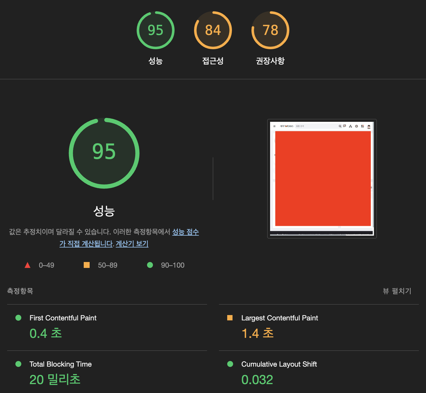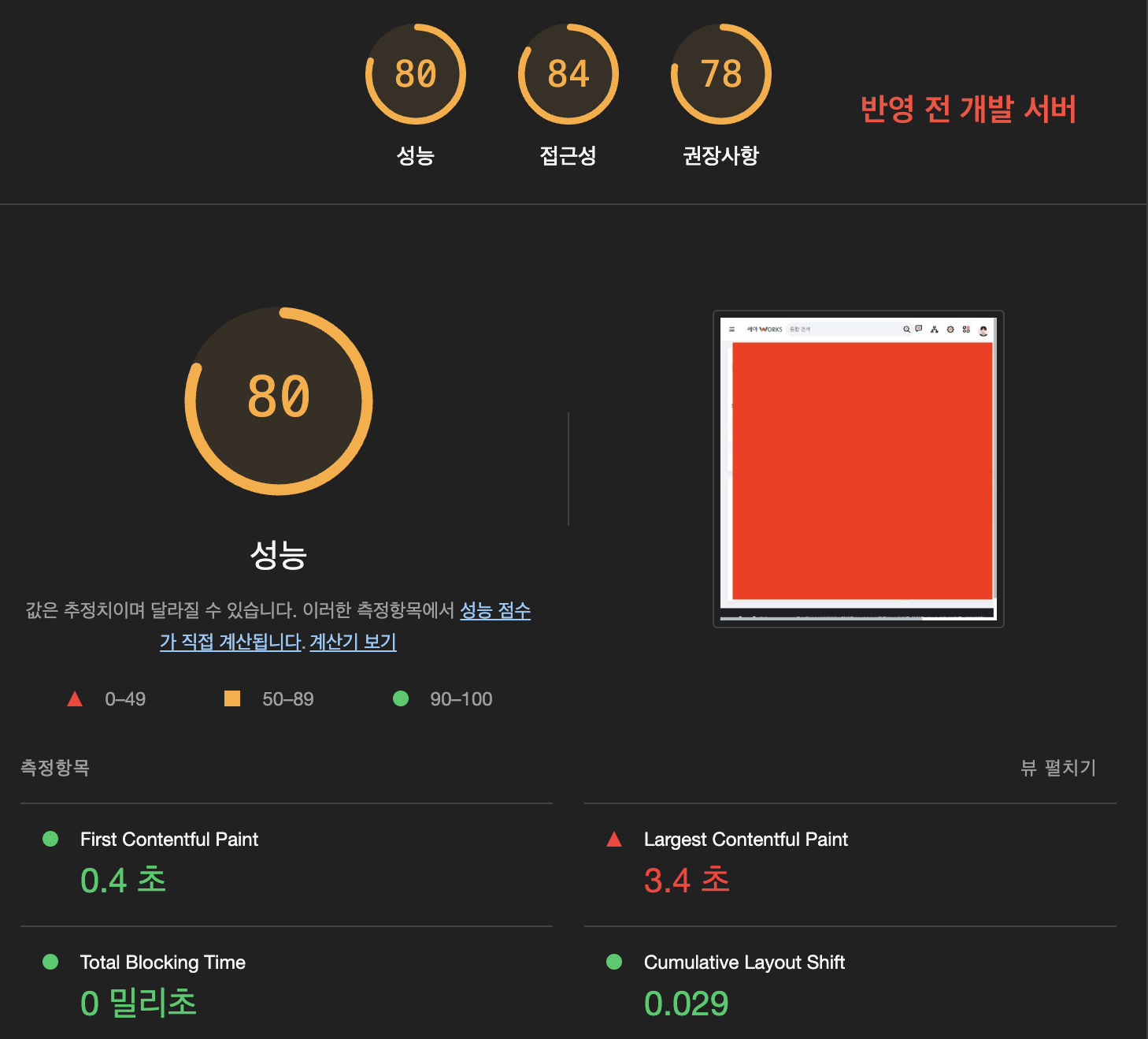 LCP 성능은 3.4 -> 1.4초로 개선 된 것을 확인 할 수 있었습니다.